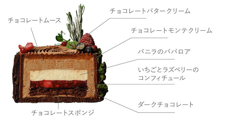 じんわり暖かな木の温もりを感じさせるhannocオリジナルのブッシュド ノエル。たっぷりの濃厚チョコレートにほっと心癒される、クリスマスにぴったりの味わいです。中からは、苺とフランボワーズのコンフィチュールやまろやかな甘さのバニラババロアがとろり。ぜひ、小さなキャンドルを灯してクリスマスの特別なひとときをお楽しみください。