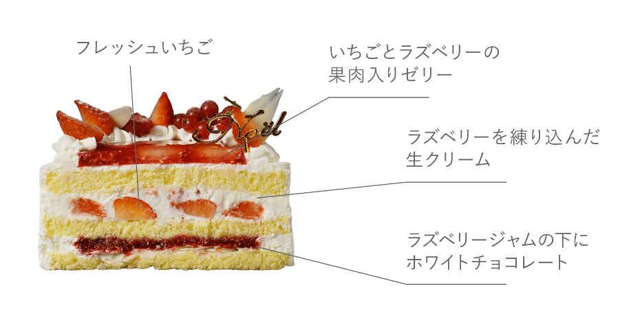 雪降るクリスマスを表現した、いちごとスポンジのショートケーキ。一番下の段にホワイトチョコとラズベリーのジャム、その上の段にラズベリーを練り込んだ生クリームといちごをサンド。トップはスライスしたいちごをゼリーで閉じ込めたプルプル食感。層によっていろいろな食感が楽しめます。果肉たっぷりの少し贅沢なショートケーキです。