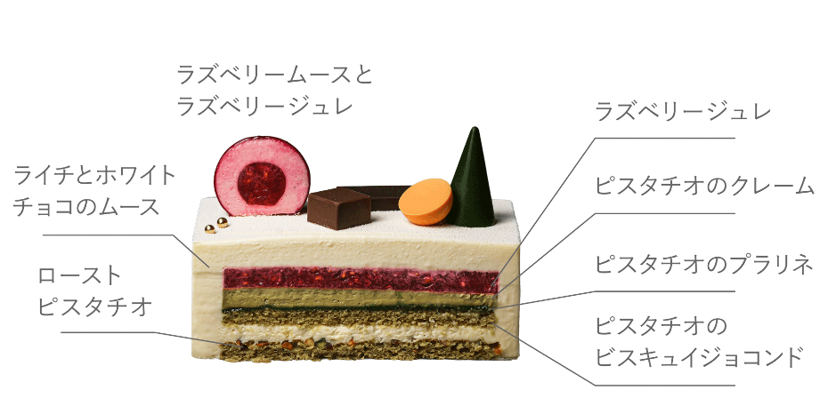 おもちゃ箱をモチーフにしたケーキが、4号サイズになって2年ぶりの登場。真っ白なライチ&ホワイトチョコムースの中に、ザクザクふんわり、異なる食感のピスタチオの層がぎっしり。フランボワーズジュレが、華やかな酸味で全体を引きしめます。上には、味わい豊かなカラフルなチョコレートを散りばめました。クリスマスの心躍るひとときをお楽しみください。